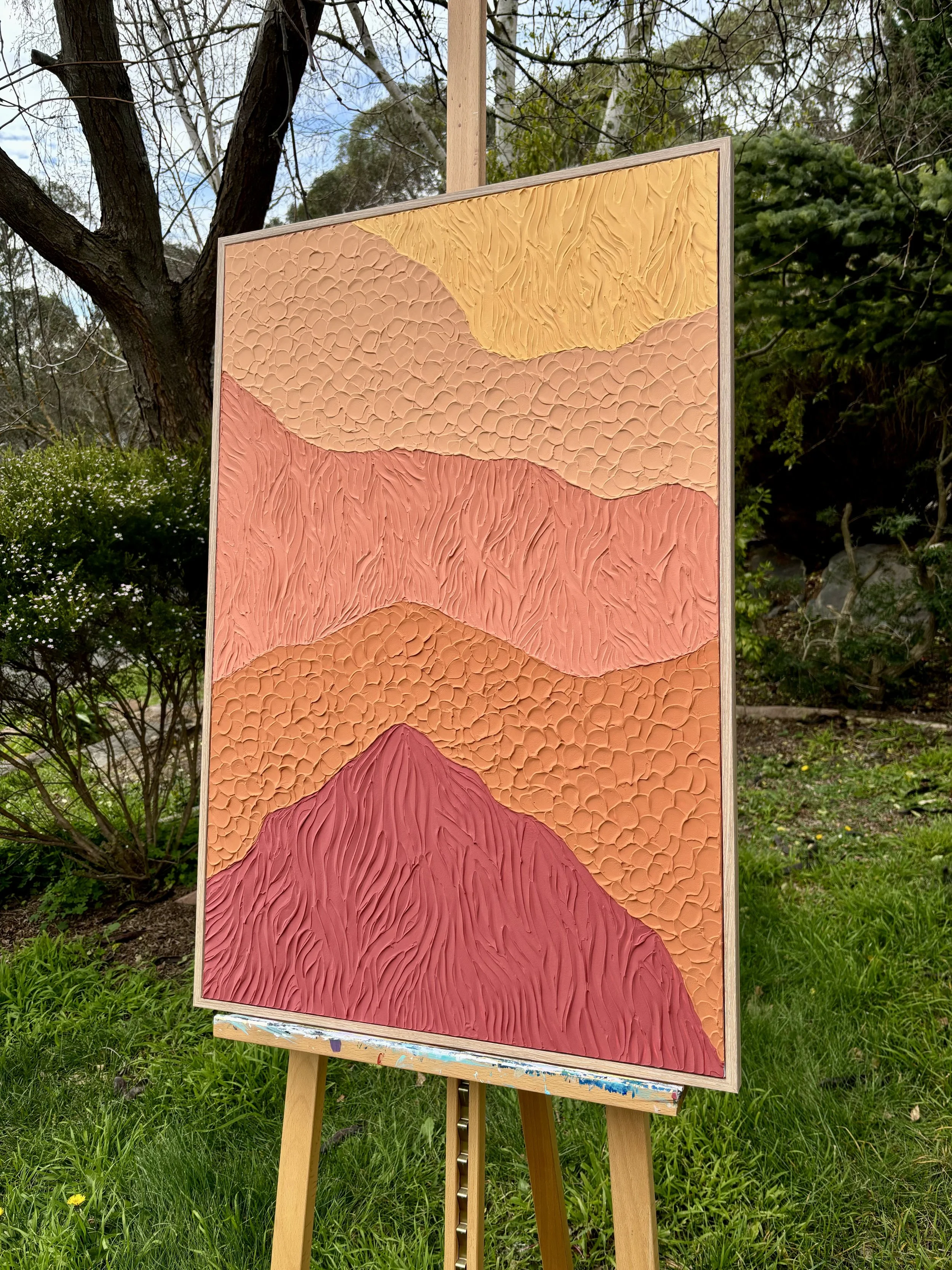 Shop › Earthsong (oxide shades) Image 1 of 7 Image 2 of 7 Image 3 of 7 Image 4 of 7 Image 5 of 7 Image 6 of 7 Image 7 of 7 Earthsong (oxide shades) $289.95 Sold Acrylic paint and texture paste applied to a stretched canvas, hung in a floating timber frame.90cm (H) x 60cm (W) Sold Added! Acrylic paint and texture paste applied to a stretched canvas, hung in a floating timber frame.90cm (H) x 60cm (W)